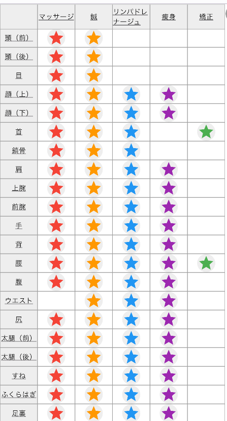 | 痩身 | セルライトは、リンパ液と脂肪細胞が付着してできる固まりで、ダイエットしても消えません。 そんなセルライトを分解して除去する施術です。 オールハンドによる強力なマッサージでセルライトをほぐして排泄させ、血液循環やリンパの流れを良くします。 |